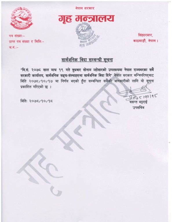 गृहमन्त्रालयले एक सूचना जारी गर्दै बुधबार देशरभरी सार्वजनिक बिदा दिने निर्णय गरिएको जानकारी दिएको छ । यसअघि वाग्मती प्रदेश सरकारले पनि प्रदेशभर ल्होसारमा बिदा दिने निर्णय गरेको थियो ।