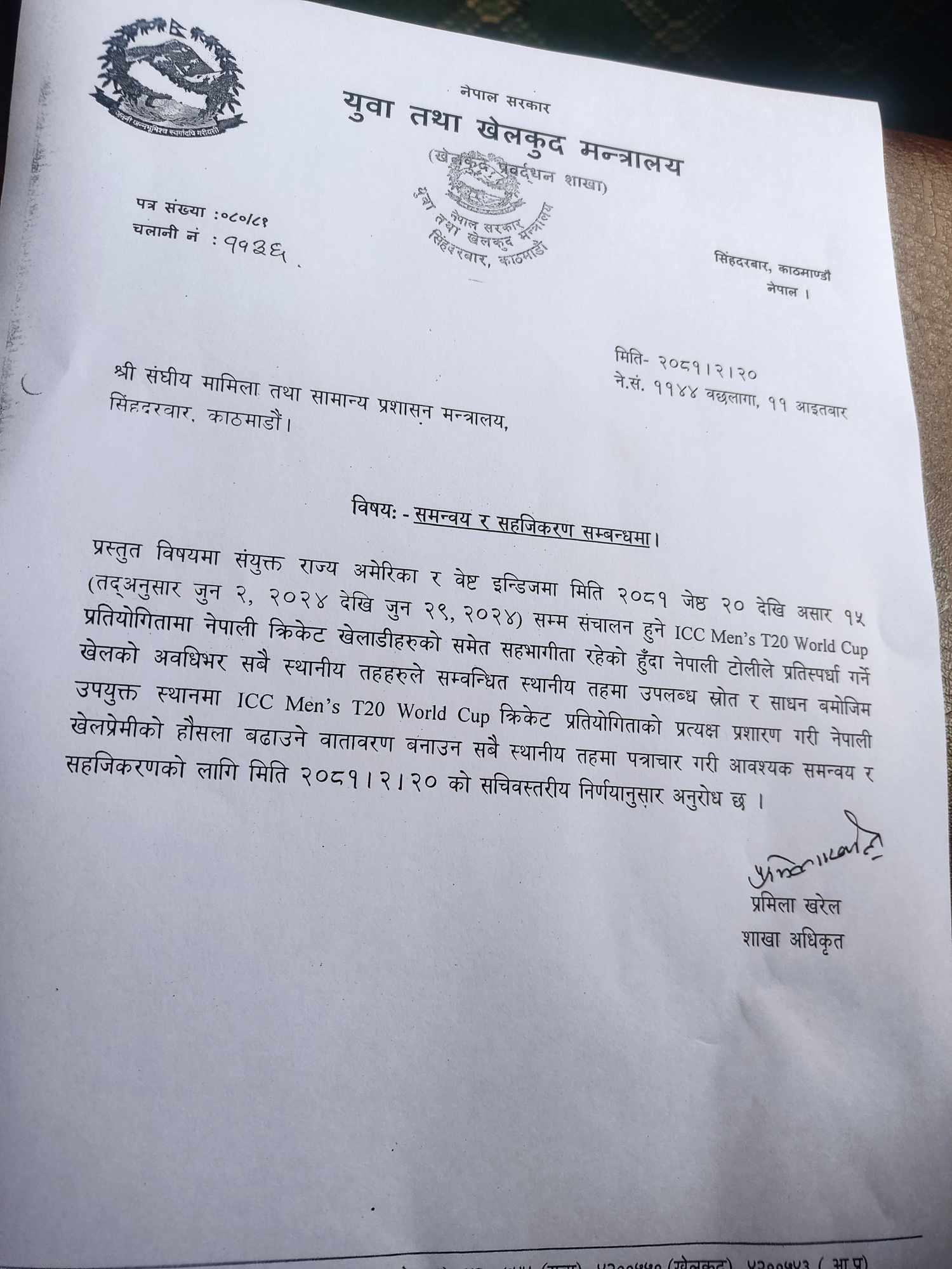 अमेरीकामा जारी टी-२० विश्वकप अन्तर्गत नेपाली टोलीले प्रतिस्पर्धा गर्ने प्रत्येक खेलको प्रत्यक्ष प्रशारण गर्न मन्त्रालयले देशभरका स्थानीय तहलाई पत्राचार गरेको हो ।