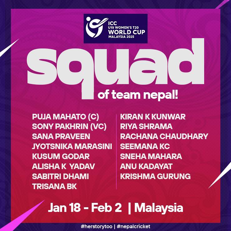 काठमाण्डु– यू १९ महिला विश्वकप टी २० क्रिकेटका लागि नेपाली टिम घोषणा गरिएको छ ।नेपाल क्रिकेट संघ (क्यान)ले शनिबार पूजा महतोको कप्तानीमा १५ सदस्यीय टोली घोषणा गरेको हो ।