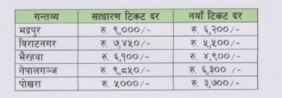 संस्कृति, पर्यटन तथा नागरिक उड्डयन मन्त्रालय, वायुसेवा संचालक संघ, नेपाल र सर्वधारणको अनुरोधमा लामो दूरीका सवारी साधन सञ्चालनमा नआउँदासम्मका लागि टिकटको मूल्य सस्तो बनाइएको हो । उल्लेखित हवाई भाडा दरहरु चैत्र १० देखि चैत्र२१ गतेसम्म लागू हुनेछन् ।
