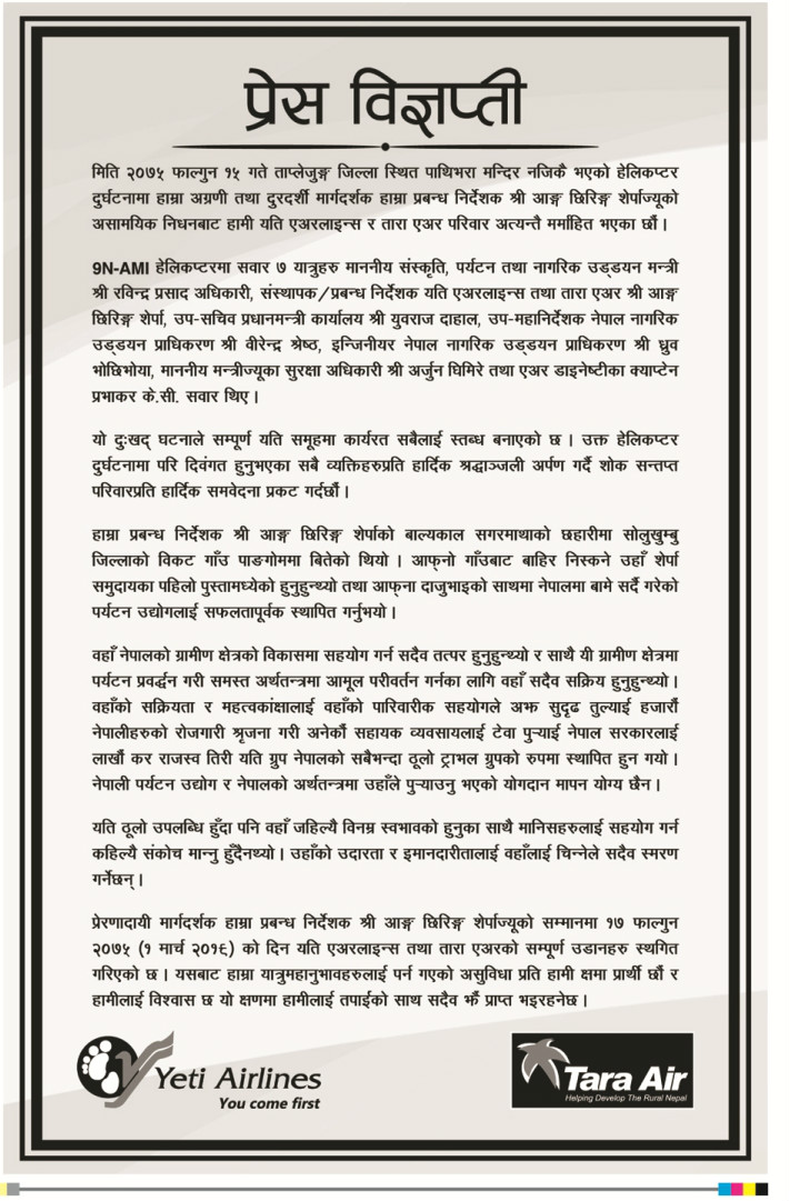 साथै एयरलाइन्सले सेवा बन्द गर्दा यात्रुमा पर्ने जाने असुविधाप्रति क्षमायाचना समेत गरेको छ। तेह्रथुमको चुहानडाँडामा विमानस्थलको सम्भाव्यता अध्ययनका लागि मन्त्री रवीन्द्र अधिकारी, एयरलाइन्सका प्रबन्ध निर्देशक शेर्पा लगायतको टोली कार्यक्रम सकेर काठमाडौँ फर्किने क्रममा बुधबार ताप्लेजुङको दारेभीरमा हेलिकप्टर दुर्घटनामा परेको थियो।
