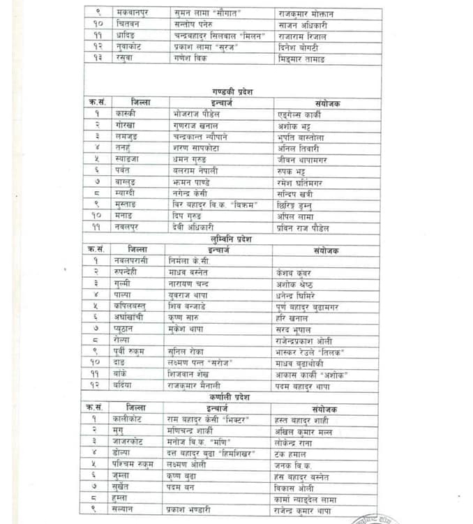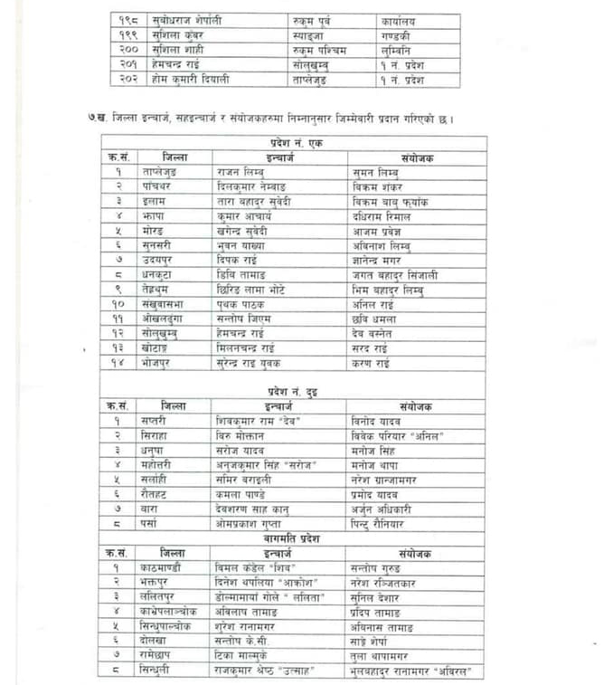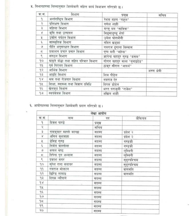 वाईसीएलले सातै प्रदेशका इन्चार्ज तोकेको छ । त्यस्तै १७ विभाग र दुई आयोग प्रमुख समेत टुंग्याएको छ । त्यस अलवा जिल्ला इन्चार्ज, सहज इन्चार्ज र संयोजथक समेत तोकिएको छ । वाईसीएलले पूर्व पदाधिकारी, हालका पदाधिकारी र प्रदेश संयोजक रहेको ३० सदस्यीय स्थायी समिति समेत बनाएको छ ।