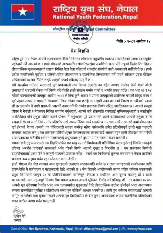 विज्ञप्तिमा भनिएको छ, ‘हाम्रो संगठन जेनजीसहित आमयुवाले उठाएका मागप्रति सचेत छ र तिनको सम्बोधनका लागि प्रारम्भदेखि नै एक्यबद्धता र पहल लिँदै आएको छ । तर सरकार चुनावतर्फ केन्द्रित हुनुको साटो अनावश्यक राजनीतिक प्रतिशोधमा रमाउन खोजेको देखिन्छ ।’